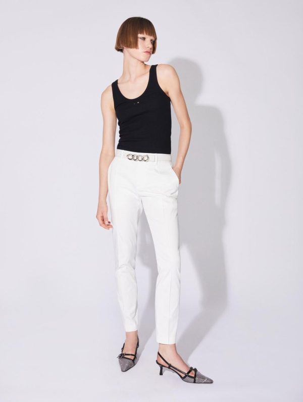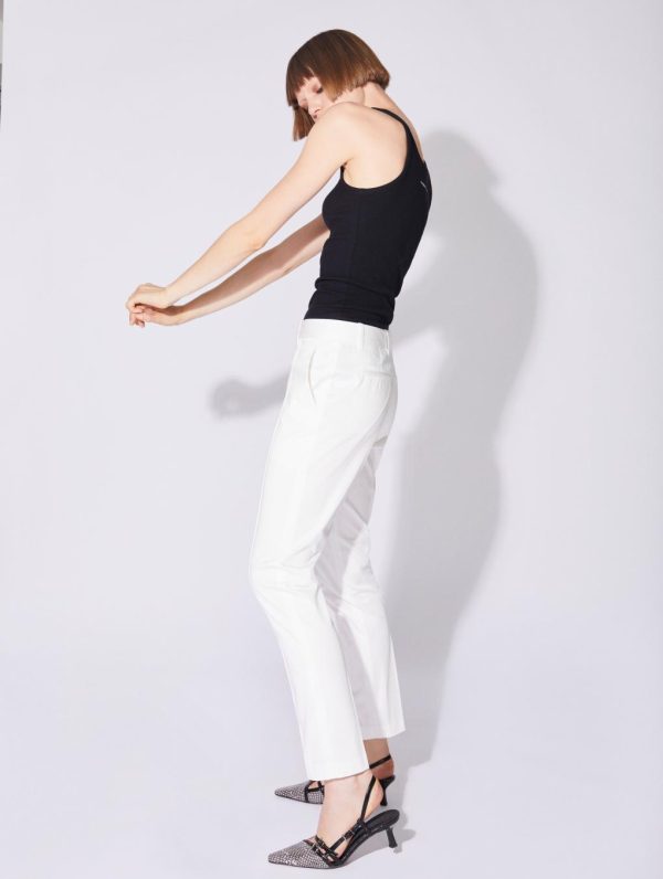 Our iconic Roxy trousers come in a cotton stretch version, ideal for the summer season. The sewn pleats ensure a streamlined silhouette while the slant pockets and rear welt pockets bring structure. Waist loops enable these classic trousers to be worn with a leather belt to accessorise a cotton tank top. The comfort and elegance of these Roxy trousers make them an eternal favourite in the Barbara Bui wardrobe.Model measures 175cm tall, with 86cm hips, 59cm waist and 79cm bust / Model measures 5’9″ tall, with 34″ in. hips, 23″ in. waist and 31″ in. bust.
