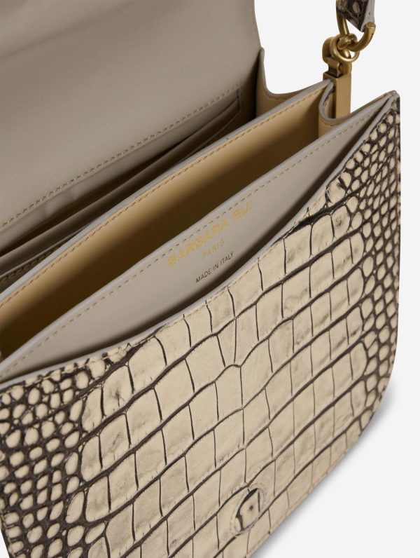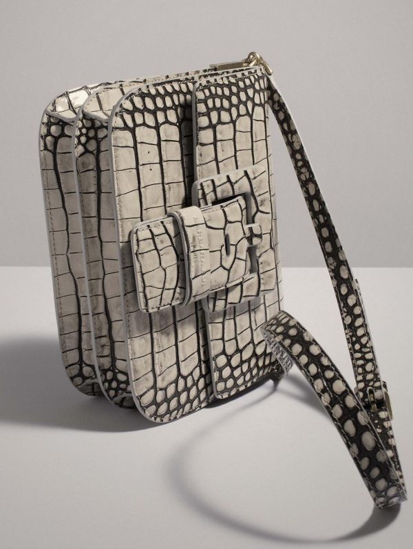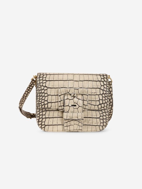 TOUCH ME bag in black patina ivory croco embossed leather. Magnetic closure flap with reinforced leather maxi buckle, the signature of our ‘ME’ line of bags. Adjustable shoulder strap with buckle for carrying over the shoulder or across the chest. Back and front pockets, double interior compartment with pockets. Height: 19 cm / Length: 22.5 cm / Depth: 7.5 cm.Height : 19 cm – Longueur : 22,5 cm – Depth : 7,5 cm.100% Calf leather