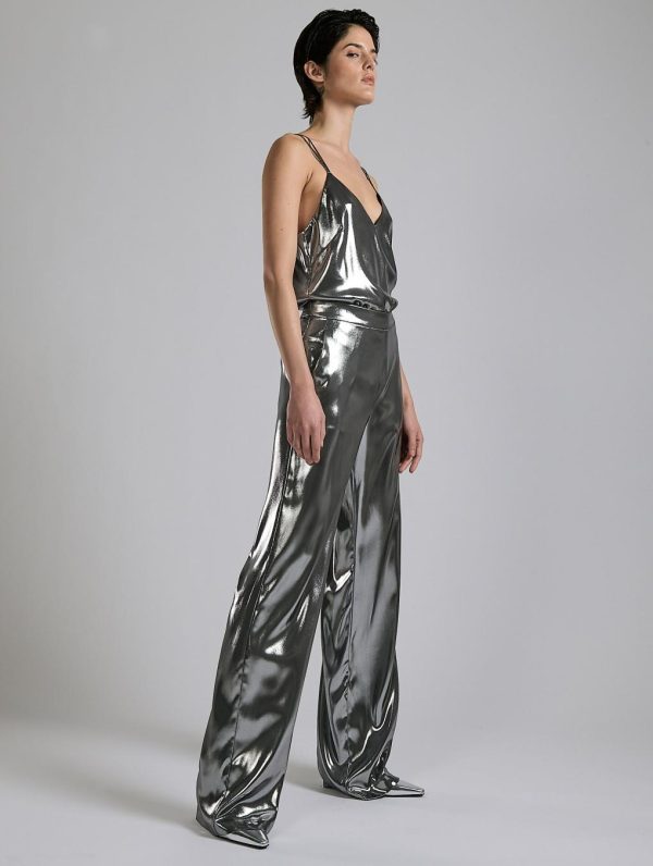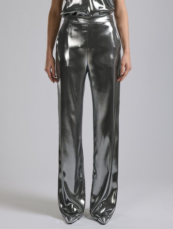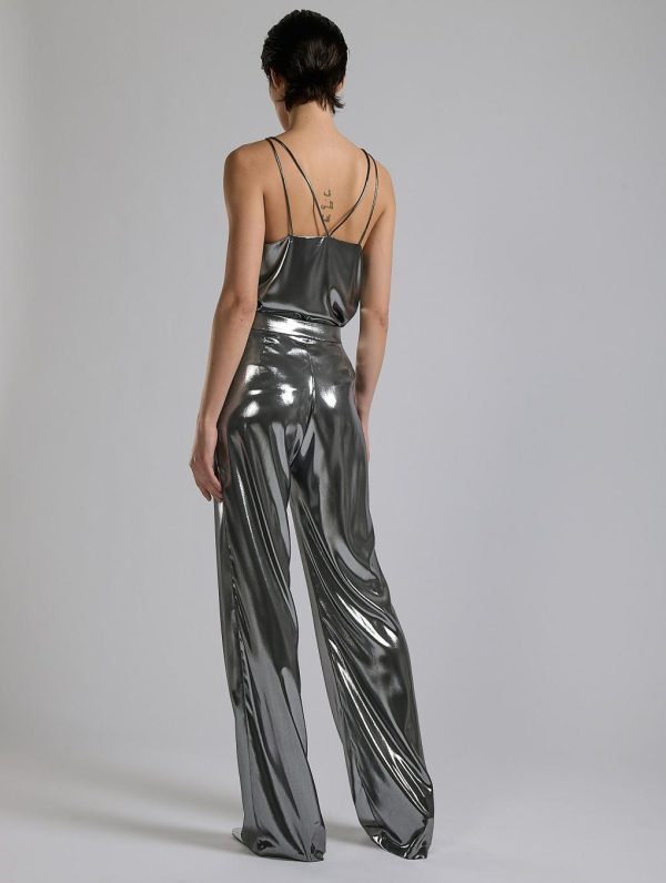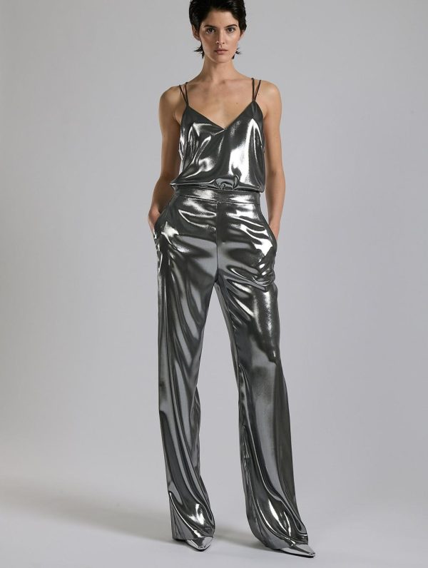 Step into the spotlight with these stunning satin lamé trousers that capture the glamour of a night out with their mesmerizing liquid-metal finish. The luminous silver hue catches the light beautifully for a contemporary, feminine look that commands attention. Featuring a fluid straight-leg silhouette with an effortlessly chic androgynous appeal, these sleek pocket-free pants drape elegantly for a confident, polished appearance. Perfectly pair them with our matching camisole top and tailored suit jacket in the same luxurious lamé fabric for a complete statement ensemble.