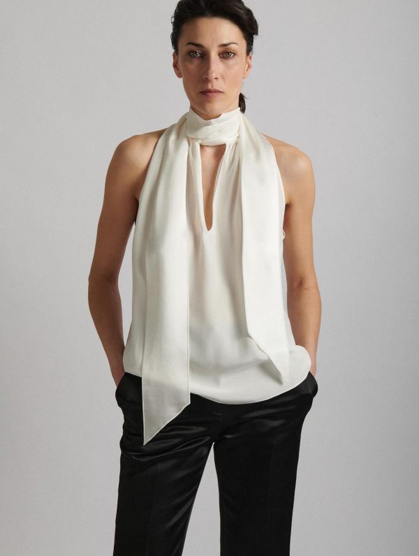 A promise of elegance, this lavallière top in silk crepe is the ideal piece to wear to a cocktail party or ceremony. Its timeless ivory hue illuminates the fall-winter wardrobe, paired with satin suit pants, worn alone or under a tuxedo jacket.Model measures 178cm tall, with 89cm hips, 64cm waist and 86cm bust / Model measures 5’10” tall, with 35″ in. hips, 25″ in. waist and 34″ in. bust.