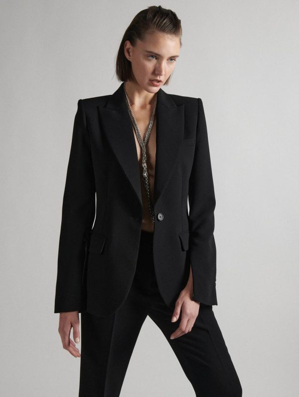Ceremonies and weddings offer the perfect excuse to wear this elegant, slim-fit jacket in fluid crepe as a total look with matching trousers and a silk satin shirt in the same hue. For a sophisticated, feminine look, this suit jacket features a wide, notched collar and an invisible zip, allowing it to be worn with sleeves open, cape-style. Popular every season for its racy elegance and quality finishes, this comfortable crepe jacket is available this season in poetic lilac, sophisticated pearl grey or timeless black.