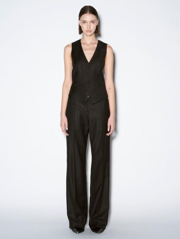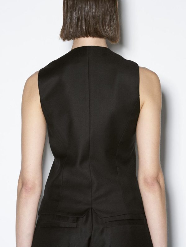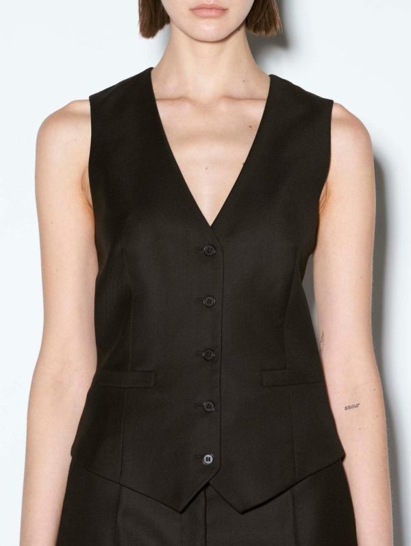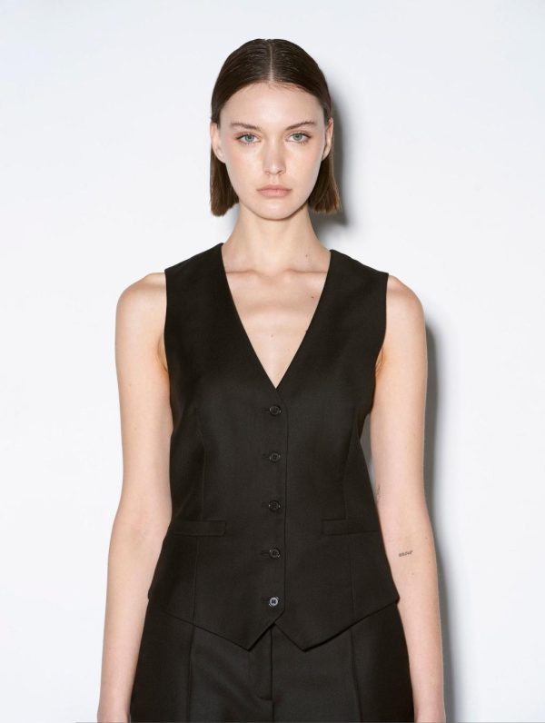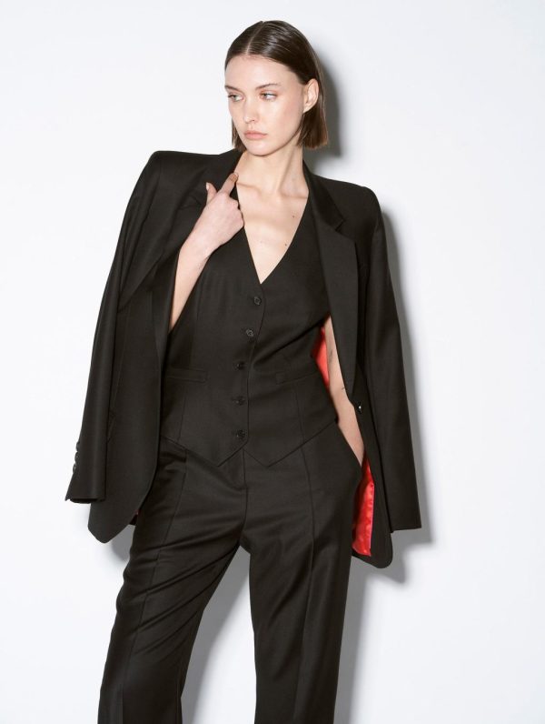 Born from a love of masculine tailoring combined with a rock style, this women’s suit waistcoat is comparable to the best pieces of tailored menswear. Made in cashmere and wool gabardine for added comfort and impeccable drape, this black waistcoat can be worn next to the skin like a top to give this seductive and timeless piece a feminine look. With two welt pockets and coloured lining, this sleeveless suit waistcoat teams perfectly with our three piece suit under our suit jacket and worn with the matching tailored trousers. This suit waistcoat is a classic and is also available in dark grey.Model measures 177cm tall, with 88cm hips, 59cm waist and 75cm bust / Model measures 5’9,5″ tall, with 34″ 1/2 in. hips, 23″ in. waist and 29″ 1/2 in. bust.