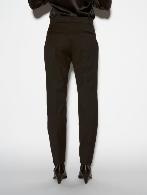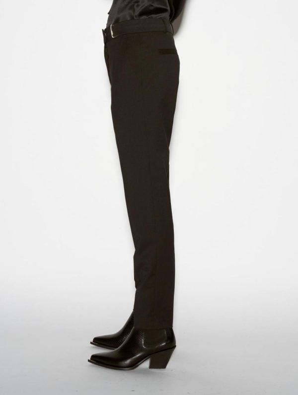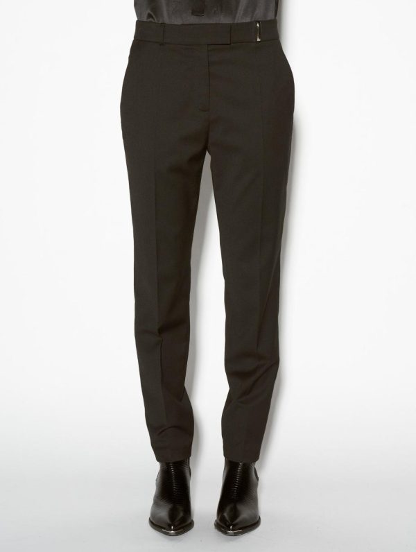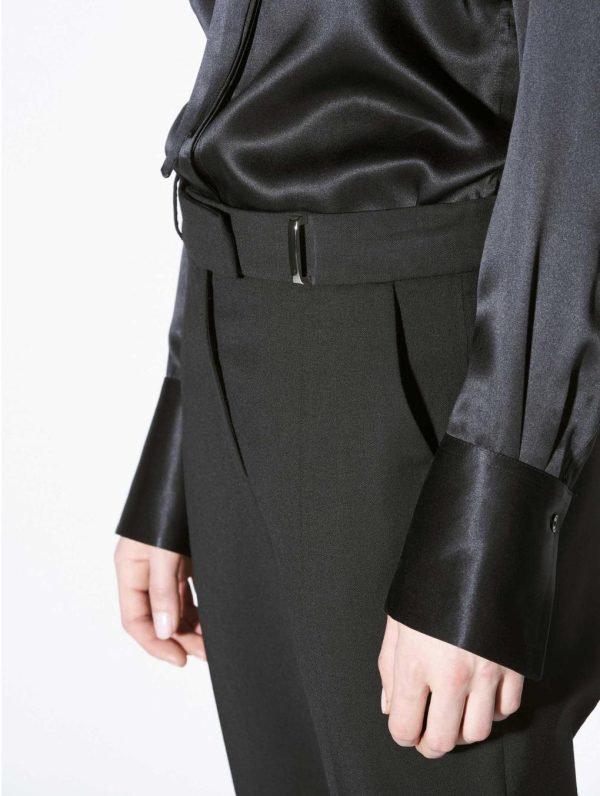 Our ever popular Roxy cut lends structured drape and everyday freedom of movement to women’s classic suit trousers. Crafted in stretch wool gabardine for the Autumn/Winter season, these black tailored trousers have a sleek and elegant look thanks to their impeccable finish. Expert in the art of tailoring, our Parisian fashion house’s sense of detail can be seen in the concealed button placket, rear welt pockets and slant pockets. These women’s suit trousers feature belt loops at the waist, including a silver metal jewelled loop for a touch of fantasy. Ideal for all occasions, these women’s suit trousers are available in black, grey or olive green.Model measures 176cm tall, with 88cm hips, 60cm waist and 79cm bust / Model measures 5’9,2″ tall, with 34″ 1/2 in. hips, 23,6″ in. waist and 31″ in. bust.