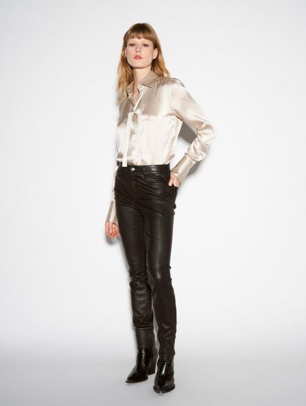 The attractive slim cut and iconic finishing details found in jeans are echoed in these stretch calfskin leather trousers. With 5 pockets including a small ticket pocket, these black leather trousers feature two rear patch pockets, belt loops at the waist and two small silver metal rivets at the back. These stylish close-fit trousers are adorned with tone on tone overstitch detail on the knees for a rock look inspired by biker trousers. With a fine-knit sweater or silk satin shirt, you will wear these slim-fit trousers in stretch leather from morning to evening.Model measures 176cm tall, with 88cm hips, 60cm waist and 79cm bust / Model measures 5’9,2″ tall, with 34″ 1/2 in. hips, 23,6″ in. waist and 31″ in. bust.