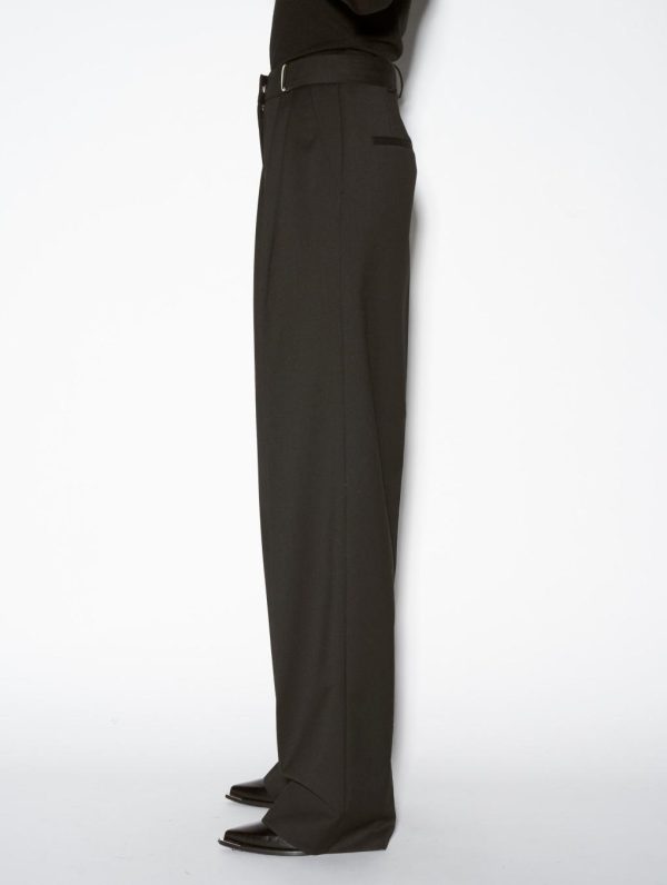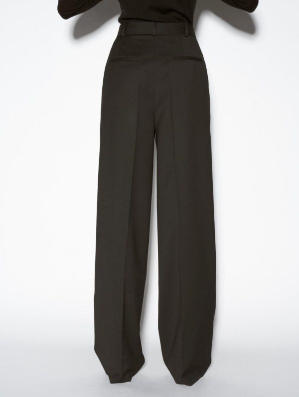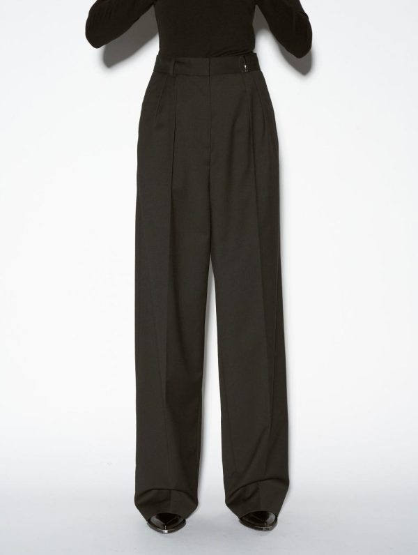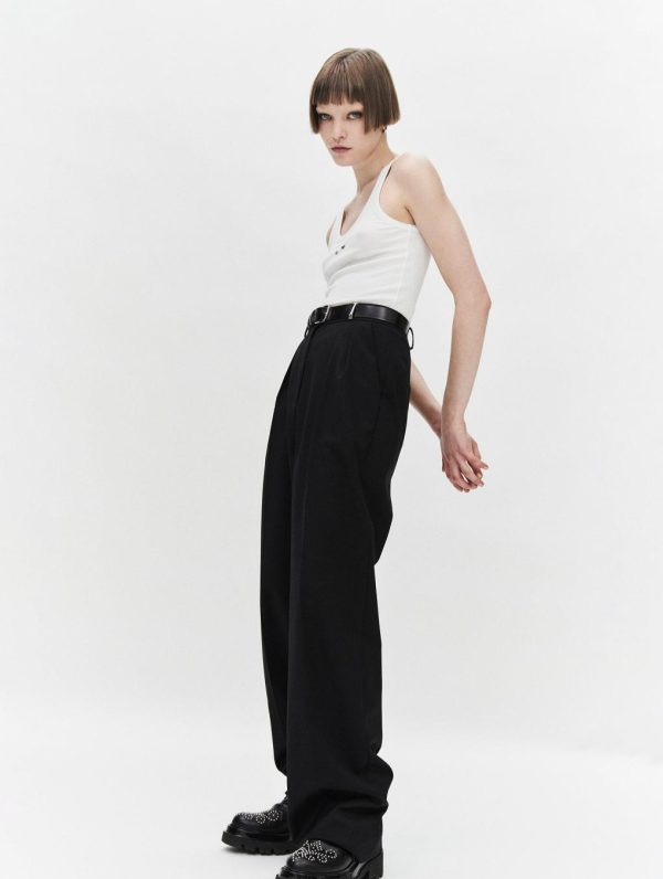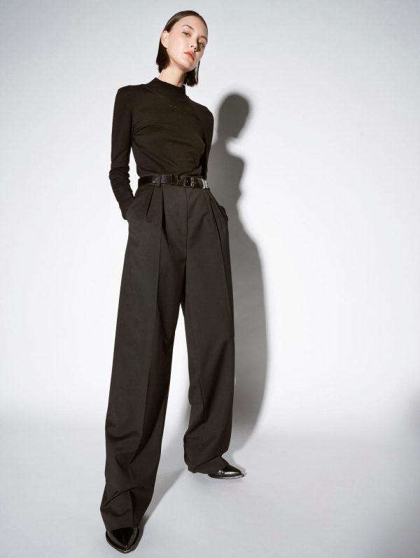 Take a leaf from our designer’s style suggestion by blending masculine and feminine codes to create a timeless wardrobe with sharp lines and clean cuts. With the accent on style and freedom of movement, these masculine-look women’s trousers feature a wide leg structured by elegant sewn pleats. Their wide straight cut evokes the outlines of the feminine silhouette. These women’s trousers in black feature slant pockets enabling you to casually slide your hands inside. The rear welt pockets, concealed button placket and belt loops, one of which is in silver metal, attest to our Parisian fashion house’s sense of detail.Model measures 177cm tall, with 88cm hips, 59cm waist and 75cm bust / Model measures 5’9,5″ tall, with 34″ 1/2 in. hips, 23″ in. waist and 29″ 1/2 in. bust.
