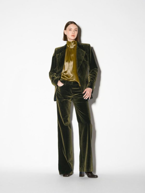 Discover Barbara Bui’s iconic colored velvet jacket, designed to elevate your wardrobe whether worn solo or paired with matching trousers for a sophisticated look that transitions effortlessly from day to evening. This stunning 70s-inspired piece features elegant printed lining with golden yellow piping for a touch of luxury. The distinctive back piercing detail adds a subtle rock edge to this classic single-breasted design, complete with 3 patch pockets and buttoned cuffs. Perfect for creating fashionable evening ensembles, layer this luxurious velvet jacket over a satin top with coordinating flared trousers. Our premium colored velvet jacket, showcased here in olive, also comes in rich plum and deep night blue for maximum style impact.Model measures 177cm tall, with 88cm hips, 59cm waist and 75cm bust / Model measures 5’9,5″ tall, with 34″ 1/2 in. hips, 23″ in. waist and 29″ 1/2 in. bust.