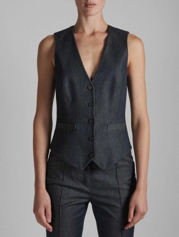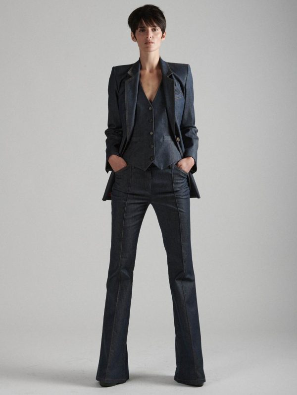 Featuring five buttons and tobacco-colored stitching, this women’s suit vest is designed to be worn with bootleg pants and the matching slim-fit suit jacket. It offers a modern and original reinterpretation of the iconic three-piece suit. Its back slit, piped pockets and contrasting stitching underline our designer’s attention to detail.Model measures 178cm tall, with 89cm hips, 64cm waist and 86cm bust / Model measures 5’10” tall, with 35″ in. hips, 25″ in. waist and 34″ in. bust.