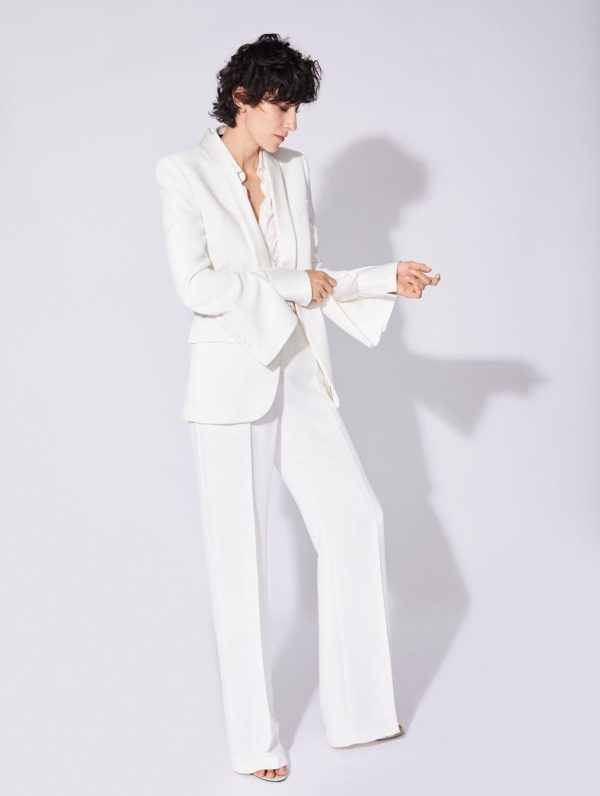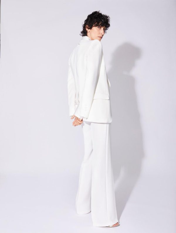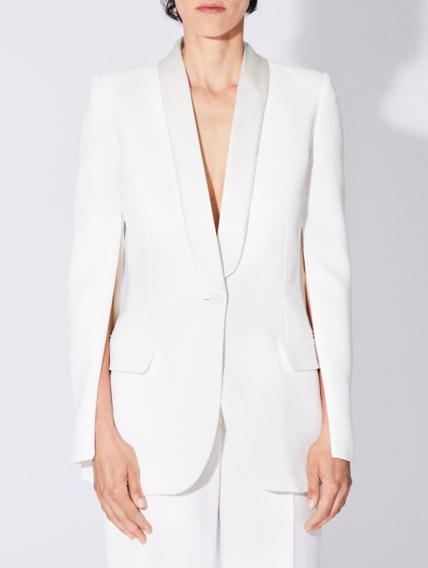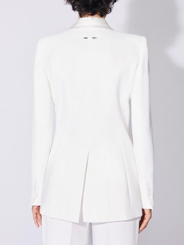 Our house’s tailoring expertise is seen in the sharp cut of this women’s suit jacket. Crafted in flowing crepe with impeccable drape, this tuxedo-style fitted jacket is characterised by its toning satin shawl collar. With its single button and flap pockets this women’s jacket can be worn in the classic way or with the sleeves open for a cape-like effect, thanks to its invisible zips at the wrists. The rear vent ensures comfort and ease of movement while the detachable piercing detail adds a rock touch. Lined with our Bengal print, this tuxedo jacket will complete your best looks of the season. Choose it in timeless black, white or linden green.Model measures 178cm tall, with 89cm hips, 64cm waist and 86cm bust / Model measures 5’10” tall, with 35″ in. hips, 25″ in. waist and 34″ in. bust.