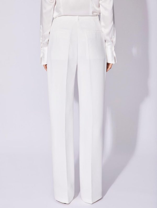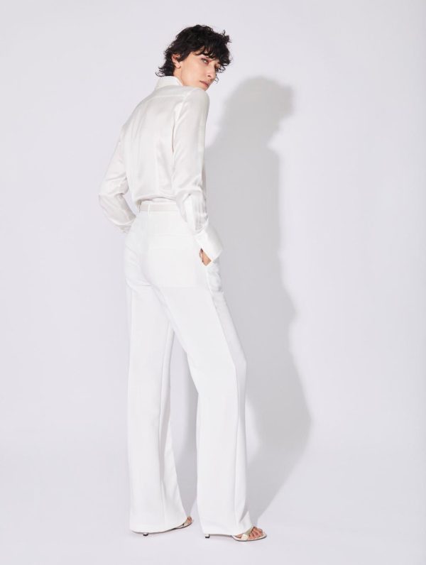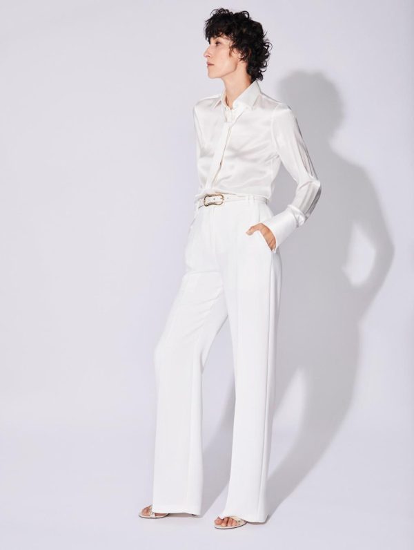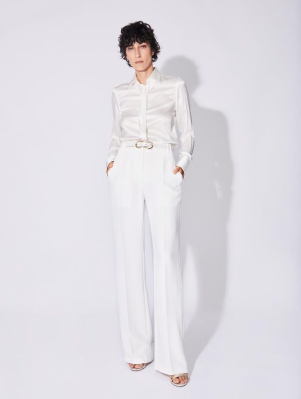You can rely on these these timeless tailored trousers in comfortable flowy crepe to give you a statuesque look. The high waist and wide leg with pleats, elegantly flared at the hem, ensure a slender, streamlined silhouette. Comfortable slant pockets and rear welt pockets reflect the importance Barbara Bui gives to comfort and the attitude of the women who wears her creations. A silk satin shirt artfully slipped into these women’s suit trousers underlines their masculine-inspired elegance. In black, white or linden green, these high waisted flared trousers can be worn separately or coordinated with jackets from our collection.Model measures 178cm tall, with 89cm hips, 64cm waist and 86cm bust / Model measures 5’10” tall, with 35″ in. hips, 25″ in. waist and 34″ in. bust.