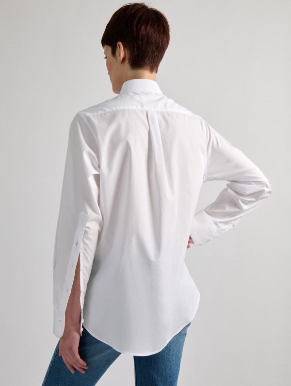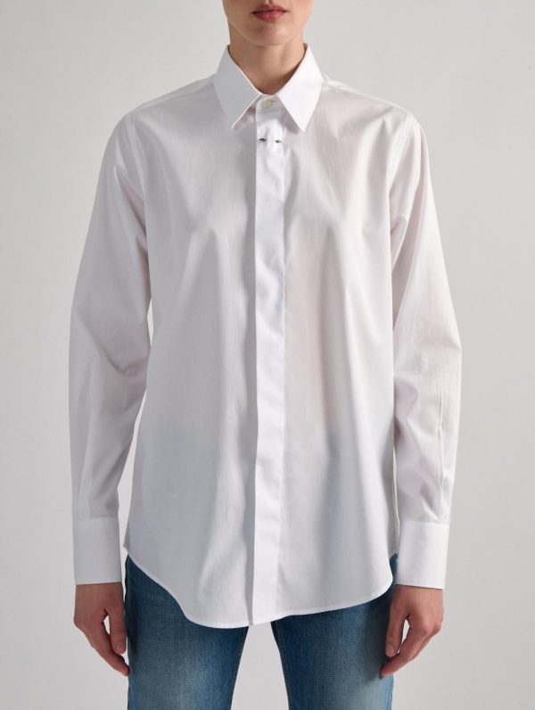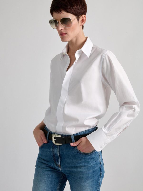 Available in white or black cotton poplin, this shirt features a button placket on the forearm to match all your fashion desires. The sleekness of its hidden button placket is matched by the rock attitude of our silver metal piercing jewel.