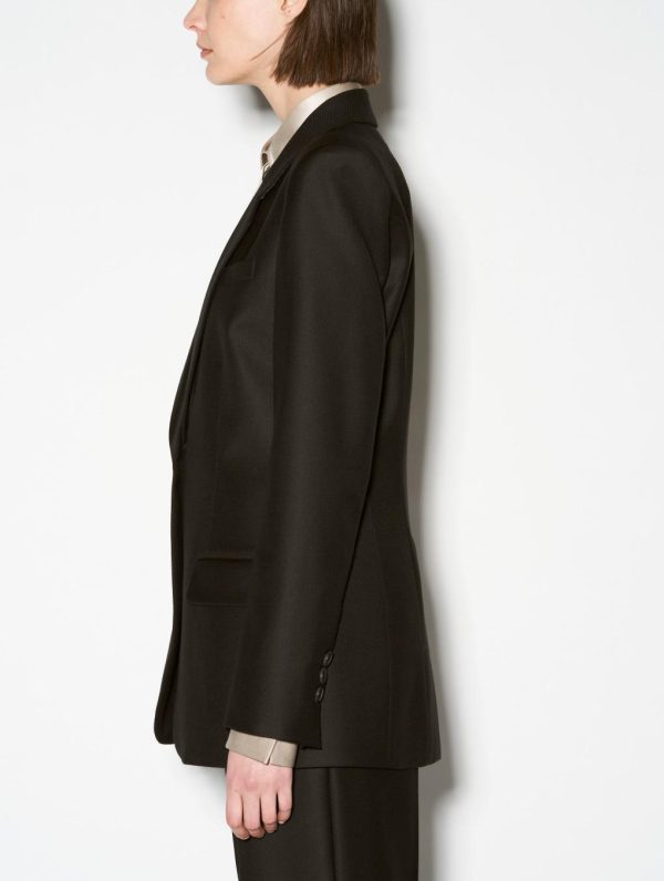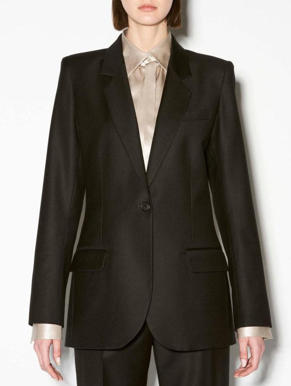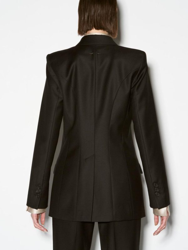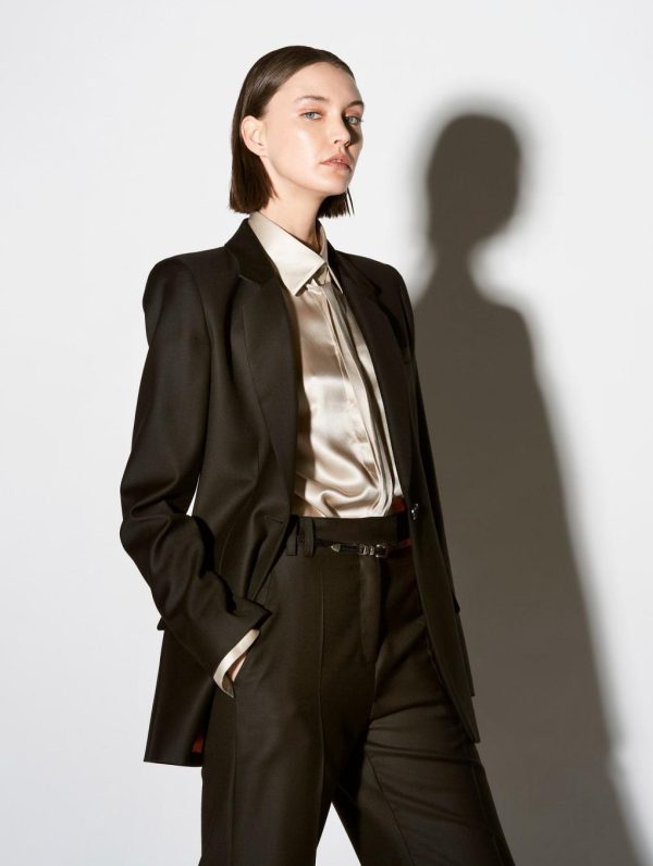 Experience the perfect fusion of Parisian craftsmanship and rebellious sophistication with this exquisite women’s suit jacket. Meticulously tailored with a contemporary slim fit, this timeless black jacket enhances your silhouette through elegant back seam construction while the rear vent ensures exceptional comfort and freedom of movement. Featuring three sophisticated welt pockets and adjustable button cuffs, this premium jacket crafted from luxurious wool gabardine and cashmere reveals a stunning coral colored lining with vibrant pink fluo piping. The iconic detachable silver metal piercing detail at the back captures Barbara Bui’s signature rock-inspired aesthetic.Model measures 177cm tall, with 88cm hips, 59cm waist and 75cm bust / Model measures 5’9,5″ tall, with 34″ 1/2 in. hips, 23″ in. waist and 29″ 1/2 in. bust.