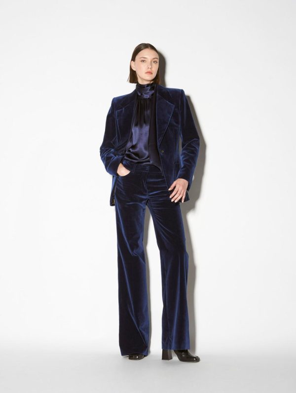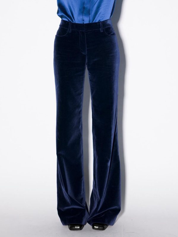 Elevate your evening wardrobe with our signature velvet suit trousers, featuring a sophisticated flared silhouette that creates a beautifully streamlined look. Perfect for pairing with our matching jacket and a luxurious silk satin blouse, these deep night blue velvet trousers deliver an elegant monochrome ensemble ideal for formal occasions and special events. Experience exceptional comfort with these soft velvet flares, designed with practical belt loops, discreet front pockets, and refined rear welt pockets. Available in rich plum, deep night blue, or elegant olive green – which stunning shade will become your new favorite? Model measures 177cm tall, with 88cm hips, 59cm waist and 75cm bust / Model measures 5’9,5″ tall, with 34″ 1/2 in. hips, 23″ in. waist and 29″ 1/2 in. bust.