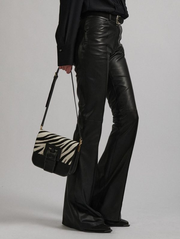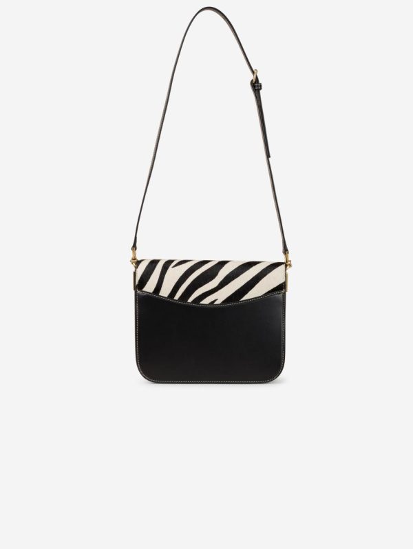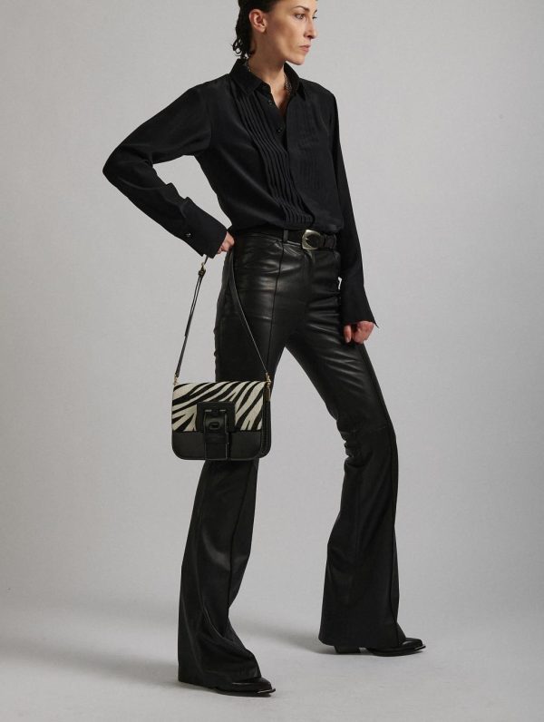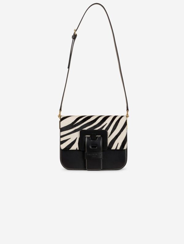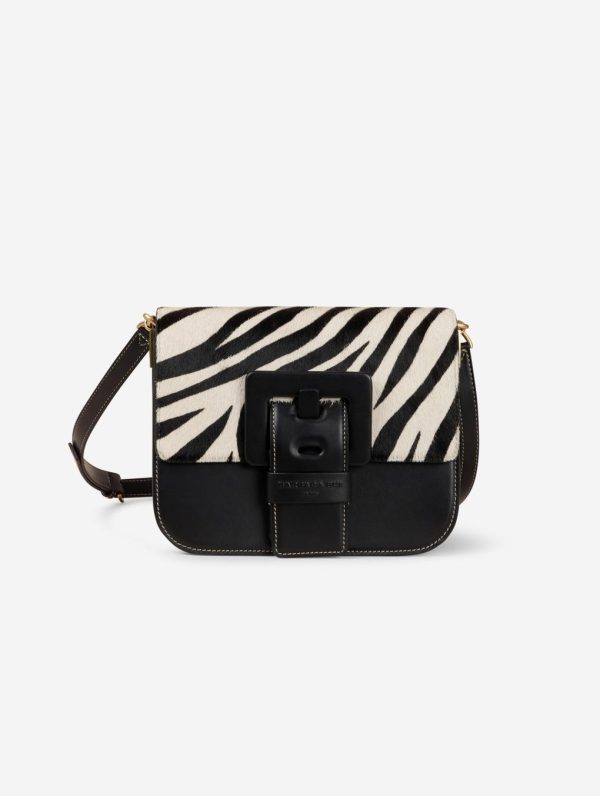 TOUCH ME bag in black leather with black and white zebra-printed calf hair leather flap. Magnetic closure flap with reinforced leather maxi buckle, signature of our “ME” bag line. Adjustable shoulder strap with buckle for shoulder or cross-body carrying. Back and front pockets, double interior compartment with pockets. Height: 19 cm / Length: 22.5 cm / Depth: 7.5 cm.Height : 19 cm – Longueur : 22,5 cm – Depth : 7,5 cm.100% Calf leather