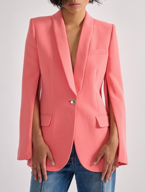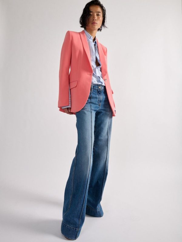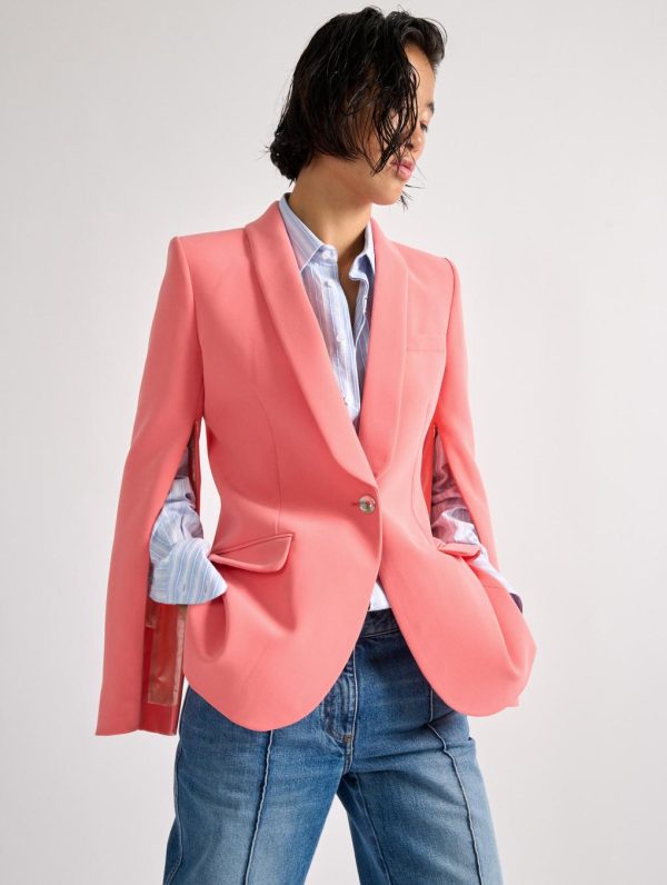 Now a staple in our tailoring collections, the fitted crepe suit jacket is a versatile and elegant statement piece. Worn with matching bootleg pants, it’s perfect for formal occasions, while paired with jeans, it’s ideal for more casual occasions. This crepe jacket, available in ivory, blue or tangerine, will look like a cape thanks to its half-open sleeves revealing the forearm or shirt sleeve.